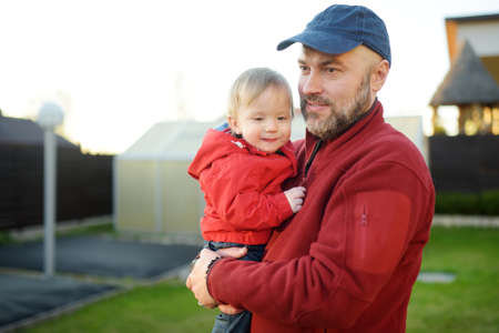 Cute toddler boy in his fathers arms. Dad and son having fun on sunny autumn day. Adorable son being held by his daddy.