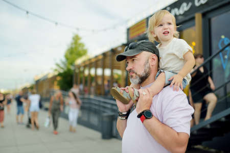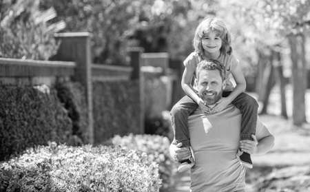 Little girl riding on dads neck. fatherhood, caring single father, family relationships and friendship. Toddler girl loving her daddy. Summer day, blue sky