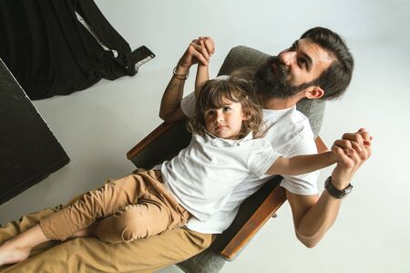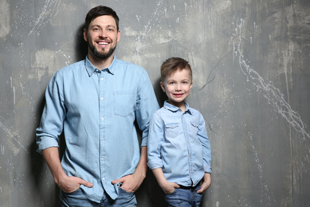 Man and boy (father and son) posing on a gray background