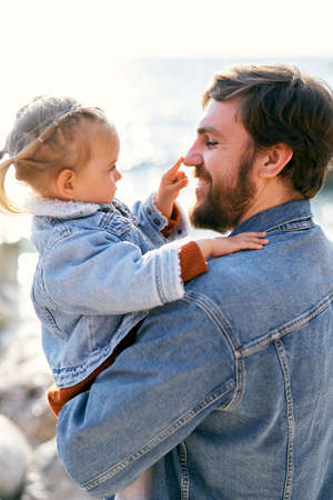 Smiling dad is holding a little girl in his arms, who touches his nose with a finger. Close-up