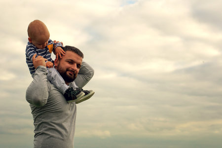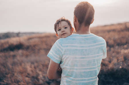 Family holiday and togetherness. Father and son together. Daddy and son smiling and hugging. Carefree. Imagination.
