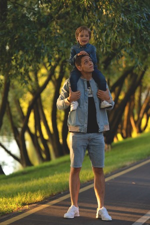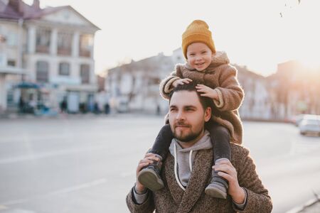 dad with son having fun outside. hipster style. casual clothes. concept of happy family