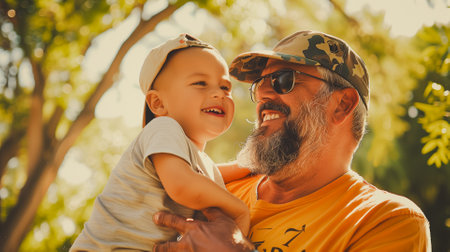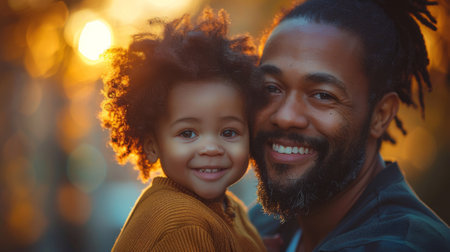 Warm and heartfelt moment between a smiling father and his young child as they share a close and affectionate bond, set against a natural blurred background.