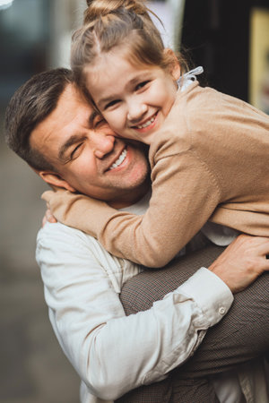 Portrait of a happy father and his little daughter in the city