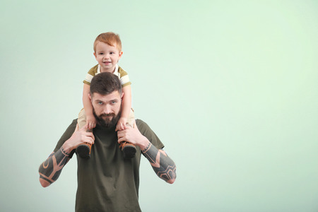Handsome tattooed young man holding cute little boy on light background