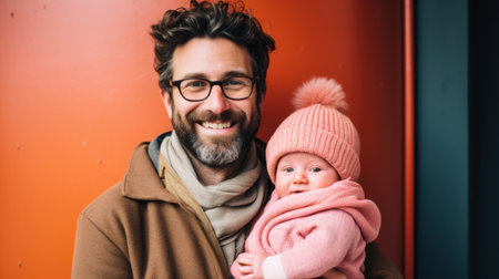 This heartwarming image captures a joyful father holding his infant with warmth and affection, highlighting the beautiful bond between them in a cozy indoor setting.