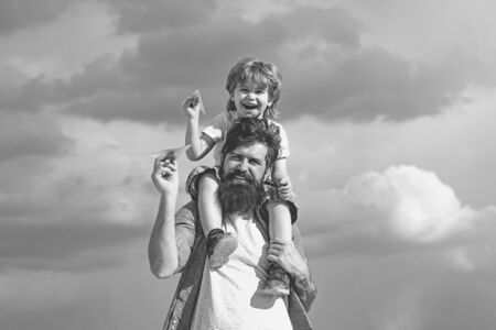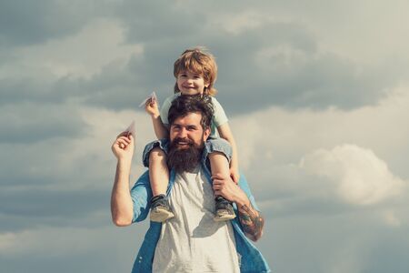 Father and son playing together. Father and his son child boy playing outdoors. Childhood. Freedom to Dream - Joyful Boy Playing With Paper Airplane.