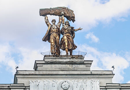 MOSCOW, RUSSIA - August 23, 2014: Sculpture Tractor operator and collective farmer on the entrance to All-Russia Exhibition Centre. Created in 1954 by design of S. Orlov
