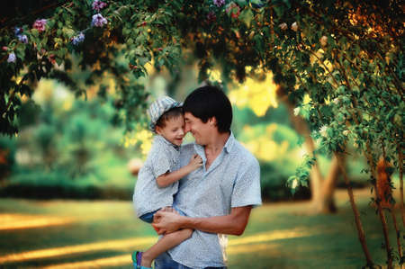 happy father spends time with his son. Father's Day. Parent and child. A man is happy in his family. Happy father with son are having fun on the field at summertime.