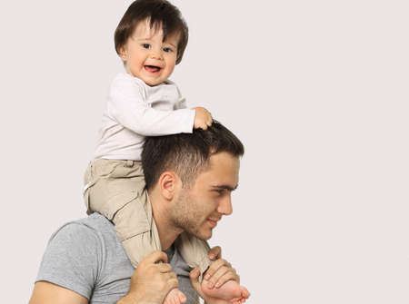 Portrait of man with beard with little son. Dad holds small child in his arms on light background. Generative AI