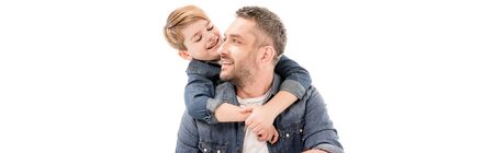 Boy with toy airplane sitting on fathers shoulders. Father and son have fun and playing with toy airplane. Family relationship with son. Love daddy.