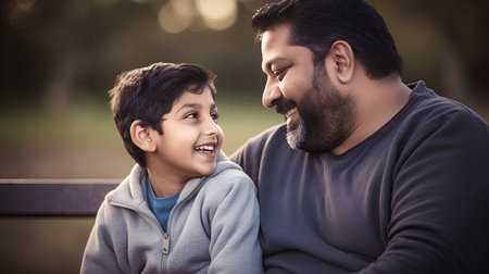 Father and son sharing a tender moment together, enjoying the warm glow of the setting sun