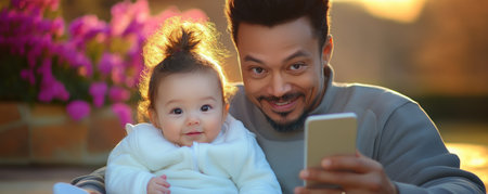 This heartwarming image captures a father and baby bonding over photos on a smartphone It showcases love, connection, and technology's role in family life Perfect for illustrating fatherhood, baby milestones, and digital memories, it portrays a beautiful example of shared happiness This image represents a touching moment AI Generative