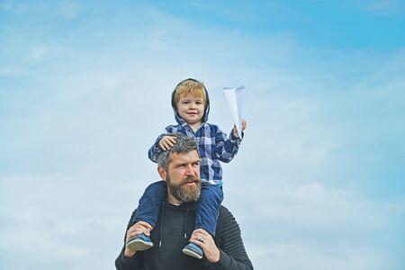 Family holiday and togetherness. Father and son together. Daddy and son smiling and hugging. Happy child playing with toy paper plane against summer sky background. Family Time.