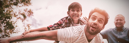 Smiling grandfather looking at man giving piggy backing to son with arms oustretched in yard
