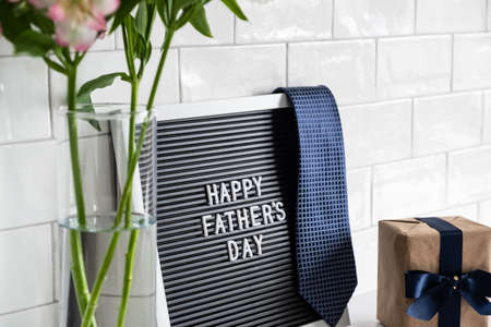 Happy Fathers Day concept. Letter board, necktie, gift box, boquet of flowers on table. Tiles on background