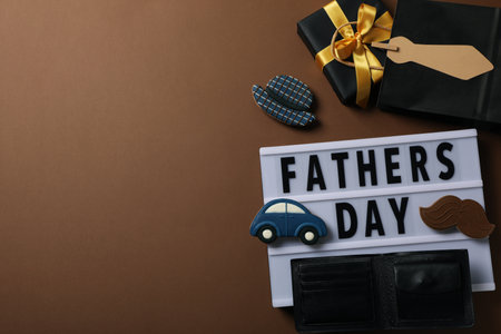 Inscription on a white chalkboard father's day, on a brown background, with gifts.