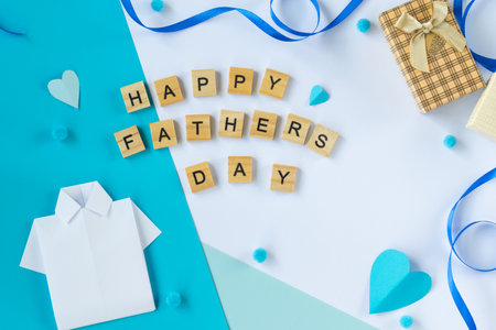 Greeting composition with Fathers Day wooden letters paper shirt tie hearts gift box blue background top view flat lay layout handmade dad celebration concept social content