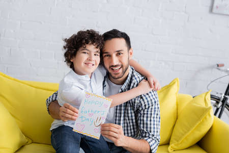 happy muslim boy embracing dad holding happy fathers day card