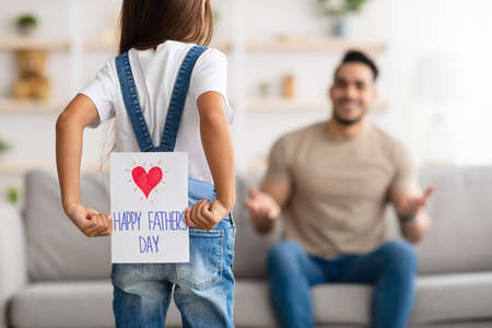 Daughter greeting excited young dad with handmade card