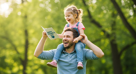 On Father's Day, a happy daughter hugs her dad with a heart in her hands