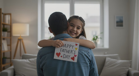 Daughter hugs dad while holding “Happy Father’s Day†card