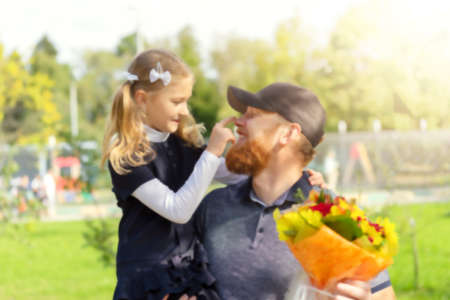 Blurred man kissing his daughter day of knowledge first day at school.