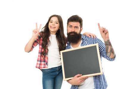 We love it. Girl with dad on white background. Happy childhood. Advertising or promotion. Father and daughter hold chalkboard copy space. International childrens day. Family news. Sale and discount