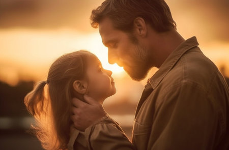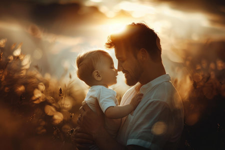 Father and son sharing a tender moment together, enjoying the warm glow of the setting sun