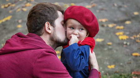 Portrait of a smiling loving Dad kissing a Happy child on the couch