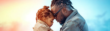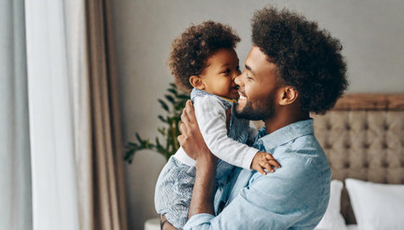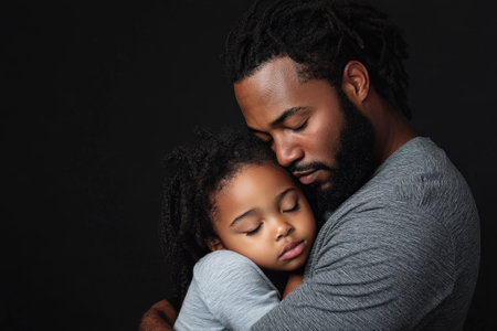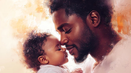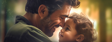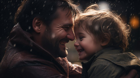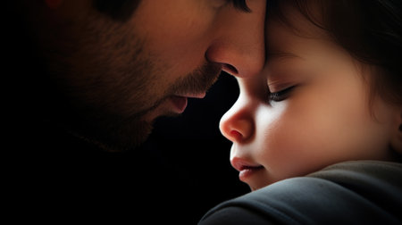 A father and child share an intimate moment, their faces touching in a tender embrace. Soft lighting illuminates the scene, highlighting the textures of their clothing and skin. The composition evokes feelings of love and connection. This image can be used in a variety of commercial and editorial contexts.