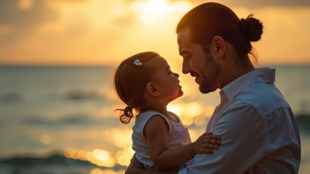 father holding smiling daughter, golden sunset beach moment of joyful bonding and love, with smiles and emotional connection, family, parenting, childhood