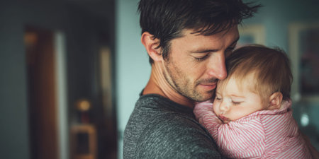 Father gently holding his sleeping baby daughter close to his chest, expressing tender love and parental closeness in a heartwarming family moment at home