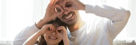 Smiling father and little daughter having fun at home, making fingers like glasses eyewear shape looking through binoculars smiling looking at camera. Horizontal photo banner for website header design
