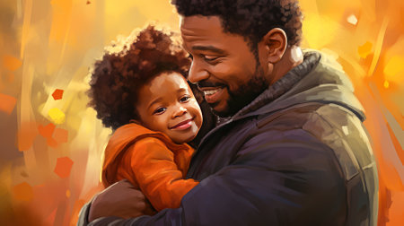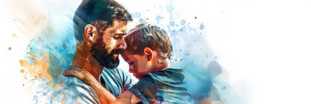 Tender moment between father and child, warm embrace, abstract watercolor background.