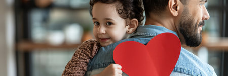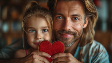 Loving father receives a heart-shaped card from child, family affection. Father's day