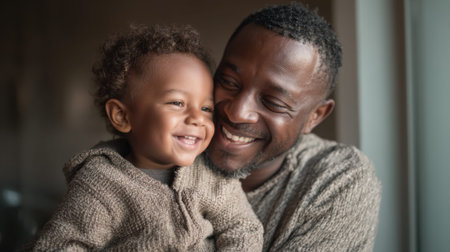 A smiling man cradles a happy toddler; both warmly lit, earthy tones create a joyful portrait