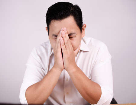 Sad depressed anxiety Asian man thinking contemplating bad thing happened in his life, stress exhausted feeling down expression, financial or relationship problem concept