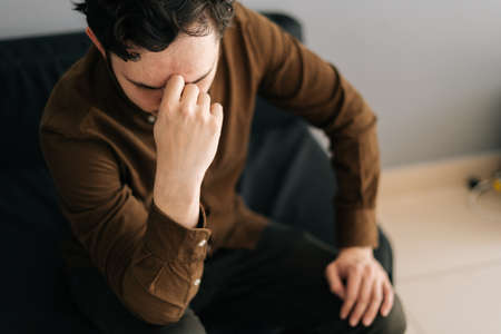 Close-up of stressed young man sitting alone feeling sad worry regret or fear, holding hand on forehead, depressed and desperate home. Suffering emotional pain and unhappy, mental health.