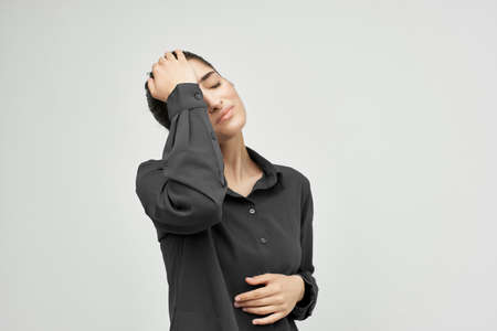 woman in black shirt headache discontent trouble light background