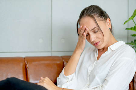 Woman touch her face with hand and look serious or stress from mental health problem. She also sit on sofa in living room of her house and stay alone.