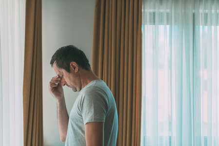 Depressed man is standing by the window. Sad disappointed male person with mental health problems, selective focus.