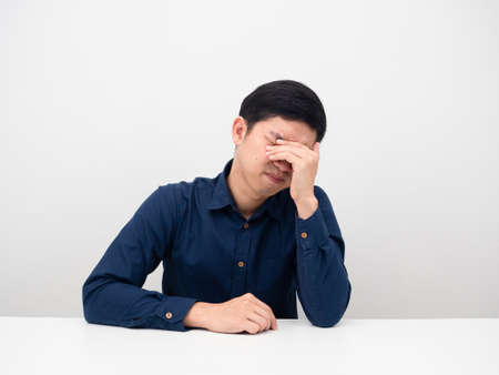 Young Asian man sleeps with tired overworked isolated on a white background.