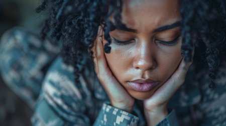 A sad female soldier holds her head with her hands . Post-Traumatic Stress Disorder Awareness Day.