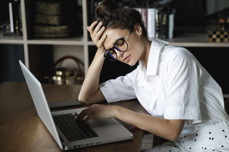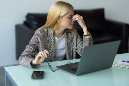 A stressed woman sits at her desk in the office. After a long period of laptop use, a tired businesswoman removes her spectacles, suffering from eye strain and dry eyes syndrome.