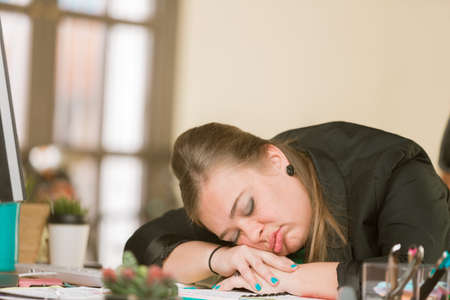 Portrait of female office worker taking nap on the table in office room, relaxing from work