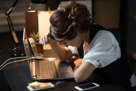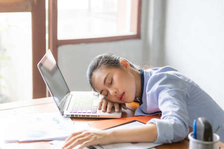 Asia business women feeling sleepy after long time working at the office desk in front of laptop. Business and finance concept.