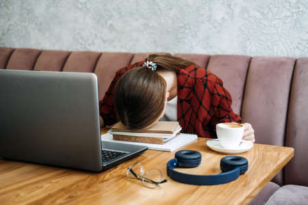 Student girl studying hard exam and sleeping on books in cafe. Tired Girl working