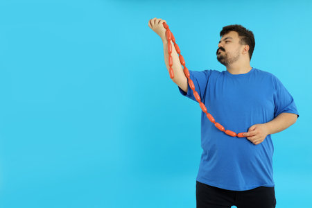 Overweight man with excess belly fat, copy space