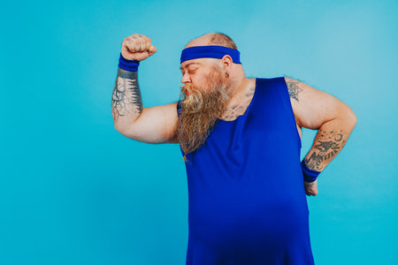 Funny fat redhead man in sportswear isolated on blue studio background exercise train for weight loss. Overweight guy workout do sports for better body shape. Physical activity concept.